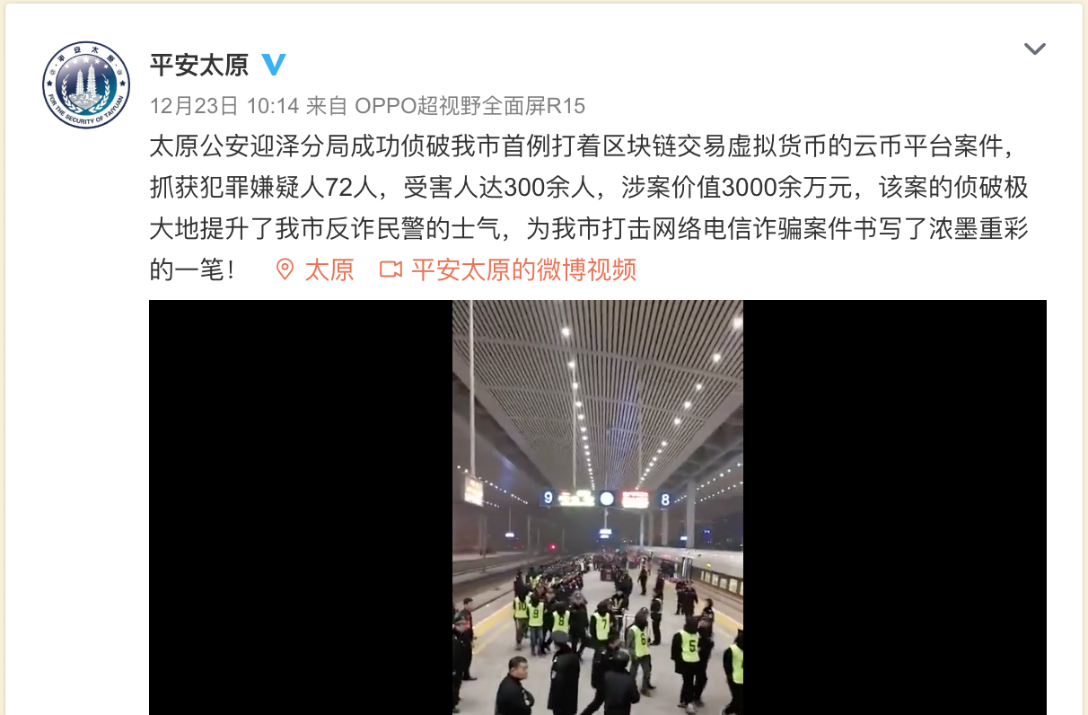近日,山西省太原市公安局官方微博披露消息稱,太原公安迎澤分局成功偵破該市首例打著區(qū)塊鏈交易虛擬貨幣的云幣平臺(tái)案件,抓獲犯罪嫌疑人72人,受害人達(dá)300余人,涉案價(jià)值3000余萬(wàn)元。