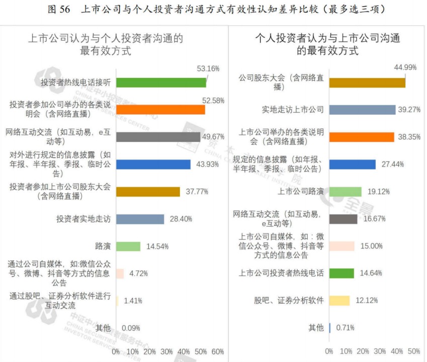 二是,上市公司與中小投資者溝通的方式和內容存在偏差,影響溝通效果。在溝通方式方面,上市公司最重視熱線電話,但個人投資者并不認為熱線電話有效。而個人投資者比較重視的是能更直觀了解上市公司的方式,如“公司股東大會(含網(wǎng)絡直播)”“實地走訪”,以及創(chuàng)新呈現(xiàn)形式的業(yè)績說明會。此外,在溝通的內容方面,上市公司可能對中小投資者仍然保持固有印象,即:只關注股價漲跌,不太關心公司業(yè)務和發(fā)展。但實際上,近年來中小投資者進步明顯,長期觀察E互動/互動易等平臺的問答信息可以發(fā)現(xiàn),中小投資者對公司的研究越來越深入,不僅重視財務信息,還對行業(yè)前景、公司戰(zhàn)略、生產經營,甚至企業(yè)管理等方面十分關切。