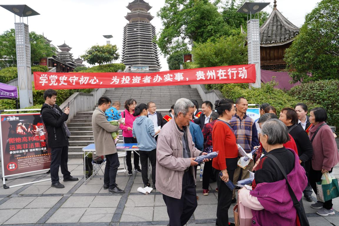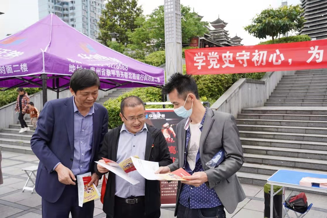 當(dāng)天下午,宣講團(tuán)一行走進(jìn)黎平縣休閑廣場,開展投教宣傳近社區(qū)活動。宣講團(tuán)搭起帳篷、展臺,開展“學(xué)黨史守初心,為投資者辦實(shí)事,貴州在行動”打擊非法集資主題宣傳,面對紛紛前來咨詢的居民,貴州證監(jiān)局有關(guān)負(fù)責(zé)同志和監(jiān)管干部、華創(chuàng)證券凱里中心營業(yè)部總經(jīng)理巫寧也紛紛加入宣傳隊(duì)伍,拿起宣傳折頁為現(xiàn)場民眾答疑解惑,向他們介紹非法集資活動的危害,引導(dǎo)他們要理性投資,切勿受高利誘惑、掉進(jìn)非法集資陷阱。