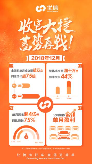 日前,中國(guó)最大的二手車(chē)電商平臺(tái)優(yōu)信(NASDAQ:UXIN)公布了2018年12月份的單月運(yùn)營(yíng)數(shù)據(jù)。受規(guī)模效應(yīng)優(yōu)勢(shì)及二手車(chē)交易旺季等多重利好的疊加驅(qū)動(dòng),優(yōu)信2018年12月總營(yíng)收超4億元人民幣,同比增長(zhǎng)75%,公司整體已實(shí)現(xiàn)單月盈利。在保持高速增長(zhǎng)的同時(shí),整體發(fā)展更加穩(wěn)健。