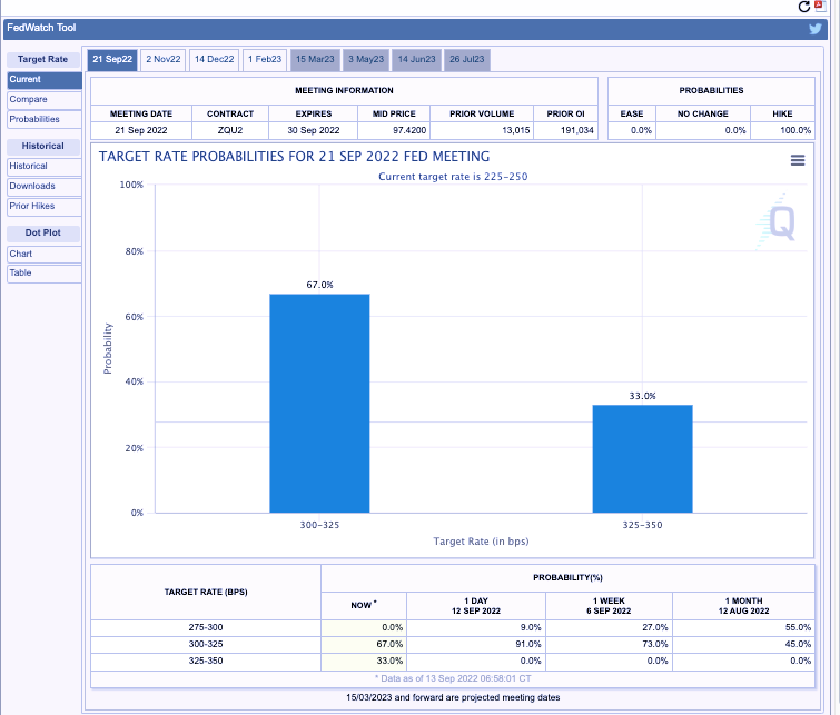 截至北京時間9月14日早上8點,《證券日報》記者根據(jù)芝商所的FedWatch工具實時測算,市場預測9月份美聯(lián)儲加息75個基點(從當前的2.25%-2.50%利率區(qū)間提高至3.00%-3.25%區(qū)間)的概率為67%,而此前并未出現(xiàn)的預期選項——大幅加息100個基點的概率躍升到33%,加息50個基點的概率則不再存在。